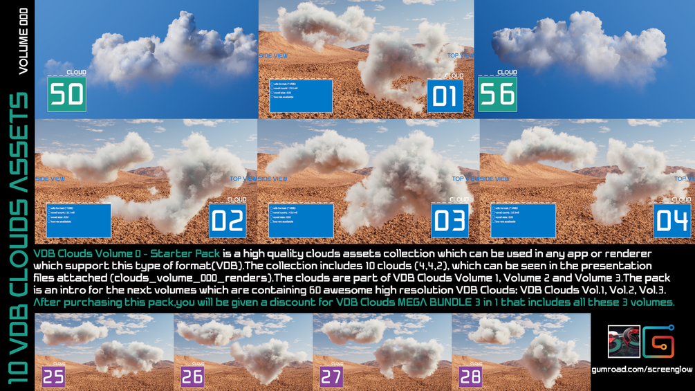 VDB Clouds Volume 0 - Starter Pack is a high quality clouds assets collection which can be used in any app or renderer which support this type of format(VDB - 3D).The collection includes 10 clouds (4,4,2), which can be seen in the presentation files attached (clouds_volume_000_renders).The clouds are part of VDB Clouds Volume 1,Volume 2 and Volume 3.The pack is an intro for the next volumes which are containing 60 awesome high resolution VDB Clouds: VDB Clouds Volume 1, VDB Clouds Volume 2, VDB Clouds Volume 3 - Cumulonimbus